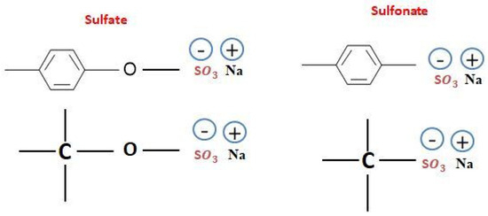 As we know, sulfonates involve the creation of a sulfur–carbon bond, although sulfation entails the creation of a carbon–oxygen–sulfur bond, as shown in Figure 1 [11].