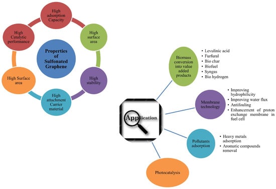 Sulfonated Graphene (oxide) (SGO) is a graphene imitative and a mixed catalyst. It is recognized for its sustainability and extensive applications in biology and chemical engineering [27,28]. Sulfonated graphene is synthesized through the sulfonation process of graphene oxide. Different sulfonating agents, including sulfuric acid, 4-diazobenzenesulfonic acid, and chlorosulfuric acid and 2-chloroethane sulfonic acid are employed in the preparation of sulfonated graphene [29]. SGO is synthesized through the oxidation and sulfonation processes applied to graphite powder. The chemical attributes of both sulfonated graphene and graphene oxide are influenced by the agents used for oxidation and sulfonation [30]. Sulfonated graphene refers to graphene featuring a frequent -SO3H bound to its surface and sheet ends. This modification enhances the electron-withdrawing capacity from the carboxylic group (–COOH), thereby augmenting the electron concentration among sulfur and carbon atoms. This, in turn, improves the stability of the catalyst under demanding reaction conditions. Additionally, the sulfonic functional group serves as a proton carrier, suggesting the material’s high density and potential application as a proton conductor [31]. The catalytic activity of SGO is 9.1 times higher compared to other solid acid catalysts and conventional sulfuric acid. The enhanced catalytic reactivity can be ascribed to the creation of hydrophobic pockets on the SGO surface. This is achieved through the integration of graphene nanosheets and oxygen-containing groups, enabling the catalyst to efficiently bind with substrates/reactants and significantly bolster proton transfer [32]. Various chemical uses have been documented employing graphene and its derivatives. Specifically, sugars like hexose, fructose, and glucose undergo decomposition into levulinic acid, through the use of a catalyst based on graphene oxide, which incorporates a -SO3H group [33]. In a study conducted by Liu and colleagues in 2012, it was discovered that sulfated graphene exhibits excellent recyclability in the context of propylene oxide hydration [34]. The characteristics and potential applications of sulfonated graphene are depicted in Figure 5.