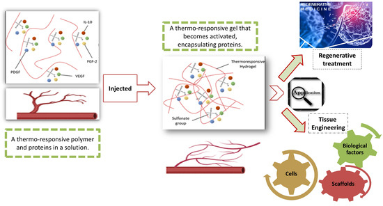 A novel biomedical strategy includes administering therapeutic proteins through injectable materials in a controlled-release fashion to effectively address this condition. A thermo-responsive injectable gel, composed of chitosan conjugated with poly (N-isopropyl acrylamide) and sulfonate groups, was created for the purpose of spatiotemporal protein delivery to protect cardiac function following MI [38,39]. Laboratory tests revealed that the thermo-responsive gel has the capability to deliver the vascular endothelial growth factor (VEGF), interleukin-10 (IL-10), and the platelet-derived growth factor (PDGF) in a sequential and sustained manner [40]. To evaluate the compatibility of the polymer and its therapeutic effects, an acute MI mouse model was employed. Immunohistochemistry analysis unveiled the biocompatibility of the hydrogel, showing that controlled protein delivery led to a reduction in macrophage infiltration and an enhancement in vascularization. Subsequent echocardiography indicated an enhancement in ejection fraction and fractional shortening following the injection of the thermo-responsive gel and proteins [41]. To enhance the delivery system, an experimental study was conducted, with a factorial design, aiming to determine the optimal combination and doses of proteins for enhanced stable vascularization and reduced inflammation [42]. This investigation utilized a subcutaneous injection mouse model [43]. The outcomes revealed noteworthy contributions from VEGF, IL-10, and FGF-2 in fostering long-term vascularization, while PDGF demonstrated minimal effects. Studies found the cardio-protective characteristics of S-GC-PNIPAM in treating MI and its capability to provide therapeutic proteins in a spatiotemporal manner, making it applicable to regenerative medication and tissue engineering (Figure 6) [38].