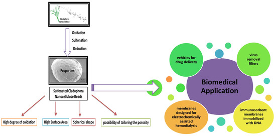 Cellulose still requires much more exploration in material science and biomedical engineering [44]. Cellulose beads have been documented as absorbent materials for various purposes, such as the elimination of metals [45], dyes [46,47], and procedures related to blood [48,49,50,51]. Hemocompatibility stands out as a crucial characteristic for materials intended for blood contact. Interactions between blood and materials trigger the initiation of blood cascades, including coagulation and the complement system. Additionally, this interaction leads to the activation of platelets and leukocytes [52]. To avoid triggering the coagulation cascade during blood-related procedures, patients are administered the anticoagulant heparin. Nonetheless, prolonged use of heparin may result in adverse effects such as hyperkalemia, thrombocytopenia, and osteoporosis [53]. To address challenges associated with the systemic application of heparin, efforts have been directed toward the creation of non-thrombogenicity materials. Various approaches have been suggested to impart anticoagulant characteristics to materials, including surface modifications using grafting of heparin-like molecules, anti-fouling agents, and heparin coatings [54,55]. Scholars have explored the integration of heparin-like structures into a diverse array of polymer materials, revealing that the presence of sulfate and sulfonate groups plays a role in influencing the anticoagulant activity of the material [56]. Sulfonated cellulose beads were created through the oxidation of Cladophora nano-cellulose to 2,3-dialdehyde cellulose, subsequently undergoing sulfonation through the use of bisulfite [57]. Nano-cellulose obtained from green algae of the Cladophora variety is an exceptionally versatile substance distinguished by a complex fibrous web structure, a notable specific surface area, heightened crystallinity, and remarkable rheological and mechanical characteristics [58]. The sulfonated Cladophora nano-cellulose beads exhibit characteristics that align with the properties illustrated in Figure 7. These attributes make them promising candidates for the creation of immunosorbent platforms, including applications in extracorporeal blood treatments. Furthermore, the inclusion of sulfonate groups in the polysaccharide chain has the potential to influence the thrombogenicity properties of Cladophora nano-cellulose [59]. The characteristics mentioned above have played a significant role in the advancement of materials based on Cladophora nano-cellulose for various biomedical purposes, as shown in Figure 7 below. These include the creation of drug delivery systems [60,61], as well as applications such as filters for removing viruses [62,63,64], membranes utilized for electrochemically-assisted hemodialysis [65,66,67], and DNA-immobilized immunosorbent membranes [68].