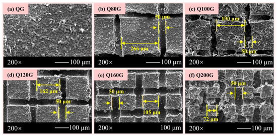 The micromorphologies of these coatings were characterized by SEM. As displayed in Figure 2a, the magnified image of the modified graphene superhydrophobic coating exhibits a micro–nanostructure formed by stacking modified graphene nanosheets. The surface and cross-sectional morphologies of the modified graphene micropillar array superhydrophobic coatings are presented in Figure 2b–f,h–l. Uniform micropillar array structures could be observed. The micropillar widths of Q80G–Q200G coatings are approximately 266, 190, 162, 105, and 72 μm, respectively. The microgroove average width and average depth of Q80G–Q200G coatings are about 50 μm and 47 μm, respectively. The surface of the micropillar top and the interior of the microgrooves were uniformly covered with the modified graphene superhydrophobic coating. In addition, the groove density per unit area (Φg) can be calculated according to the parameters measured by SEM. The Φg can be given by Formula (1):