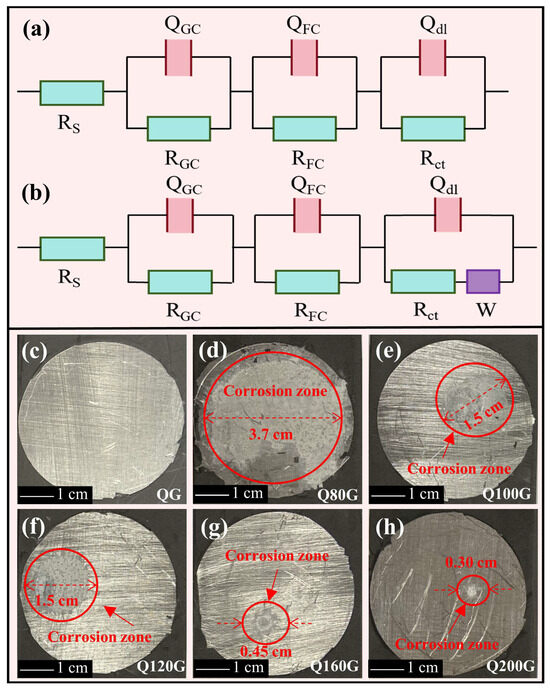 The equivalent circuits (a) R(QR)(QR)(QR) and (b) R(QR)(QR)(Q(RW)). (c–h) Macroscopic images of substrate corrosion below coatings in the soaking area.