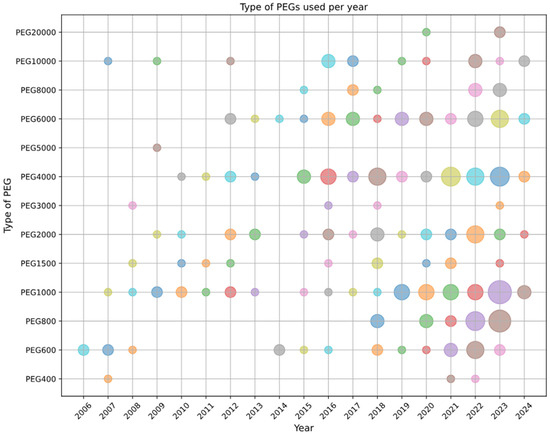 Research papers published from 2006 to the present on PEG of different molecular weights used in building applications. The size of the “bubble” corresponds to the number of papers published in a specific year on a certain PEG. (Source: data from Scopus Database, 18 January 2024).