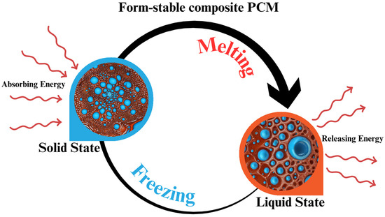 Diagram of a composite form-stable PCM that changes state, from solid to liquid and vice versa, as the external temperature varies.