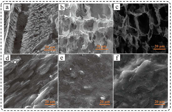 The development of a PCM composed of an aerogel matrix of polyvinyl alcohol and reduced graphene oxide (PVA-rGO) able to incorporate PEG6000 through vacuum impregnation is reported in [48]. Aerogels are materials characterized by low density, high porosity, and an extensive surface area, ideal for incorporating PEG. In fact, a significant amount of PEG, up to approximately 97% by weight, was integrated into the PVA-rGO aerogel matrix. Figure 4a shows the surface morphology of PVA aerogel, while Figure 4b,c show the surface morphology of the PVA aerogel with the incorporation of GO and rGO, respectively. The introduction of GO creates a network of interconnected pores. With the inclusion of rGO, this porous structure is more evident. A vacuum impregnation process was performed with PEG: in Figure 4d–f, it is shown that the PEG polymer was well included in the porous aerogel, confirming good compatibility among the different phases.