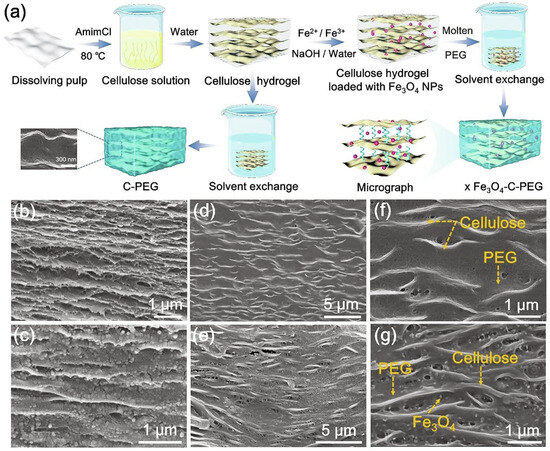 (a) Schematic representation of the process of production of the composite PCM. SEM images of (b) cellulose hydrogel, (c) cellulose hydrogel with embedded Fe3O4 NPs, (d) cellulose hydrogel with PEG, (e) 0.2 Fe3O4-cellulose hydrogel with PEG, (f) cellulose hydrogel with PEG at a higher magnification, and (g) 0.2 Fe3O4-cellulose hydrogel-PEG at a higher magnification. Reprinted from [68], with permission from Elsevier (5 February 2024).