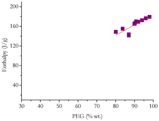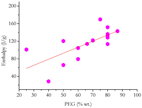 The data reported in Table 2 confirm that there is a correlation between the enthalpies of PCM and the molecular weight of PEG; i.e., the greater the molecular weight of PEG, the greater the enthalpy developed by the corresponding PCM. Furthermore, with the same grade and content of PEG, it is not clear whether, and to what extent, the type of polymer matrix influences the enthalpy of each PCM. It must be underlined, however, that the enthalpy measured on the PEG-based PCM is attributable to the PEG phase alone (i.e., the polymer matrix does not contribute in any way). In fact, in the case of adopting matrices based on amorphous polymers (i.e., thermosetting resins or non-crystalline thermoplastic polymers), this occurrence is expected. On the other hand, in the case of matrices based on semicrystalline thermoplastic polymers (e.g., polybutylene terephthalate or polyvinyl alcohol), the phase transition temperatures of the matrices are much higher than the melting/crystallization temperature ranges of any grade of PEG. Further discussion on the influence of the type of polymer matrix is given in Section 5.
