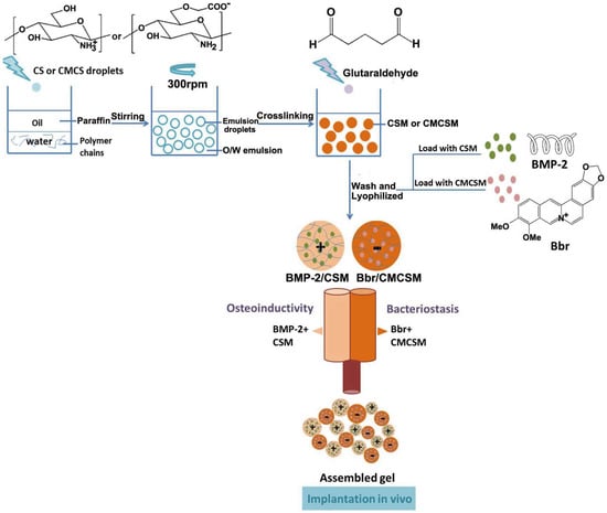 The assembly of oppositely charged microspheres loaded with Bbr and BMP-2 into a gel. Reprinted with permission from Ref. [35]. Copyright 2018 American Chemical Society.