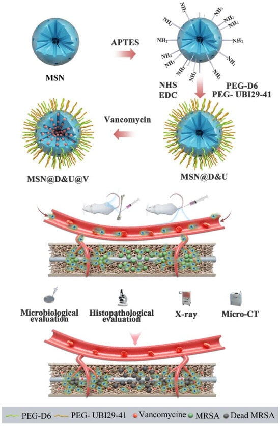 Mesoporous silica nanoparticles (MSNs) have gained significant attention as a drug-delivery carrier system due to their exceptional biocompatibility, ultrahigh specific surface area, large pore diameters, ease of surface modification, and uniform pore structures [43,44]. However, while MSNs loaded with antimicrobials can offer sustained local drug release, they often lack the ability to specifically target bone infection sites, resulting in suboptimal therapeutic outcomes. Peptide D6, known for its effective bone-targeted drug delivery, can functionalize the surface of MSNs covalently grafted with Peptide UBI29–41, which is a commonly used bacteria-targeted agent [45,46,47]. Bone-and-bacteria dual-targeted MSNs were developed to enable targeted delivery of vancomycin to the bone infection site, improving the therapeutic efficacy for orthopedic-implant-related infection (Figure 2) [48]. In another study, levofloxacin- (Lev-)loaded MSNs combined with nano-hydroxyapatite (n-HA) and polyurethane (PU) were utilized to construct a novel biodegradable composite scaffold, which can enhance osteogenesis and significantly inhibit the growth of both E. coli and S. aureus [49].
