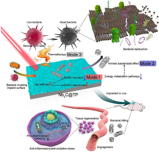 Stubborn bacterial biofilms and pervasive antibiotic resistance pose significant global threats to human health. Therefore, there is an urgent need for an implant nanomaterial with multiple antimicrobial modalities, thereby combining the ability of biofilm destruction and the low risk of bacterial resistance. MXene materials are a type of metal carbide and metal nitride material with two-dimensional (2D) layered structures and have many superior properties, including the tunability of elemental composition and structure, metallic properties, carrier migration anisotropy, and good optical and mechanical properties [160]. These materials have gained global attention across various fields (such as energy storage, biomedicine, catalysis, etc.) [161,162]. Furthermore, they also exhibit excellent antibacterial properties influenced by ultrathinness and atomic structures, according to some studies [163]. A 2D niobium carbide (Nb2C) MXene titanium plate (Nb2C@TP)-based medical implant with bacterial clearance and tissue regeneration capacities was developed for multimodal infection control (Figure 3) [164]. The results indicate that Nb2C MXene nanosheets (NSs) as an antibiofilm implant surface modification can effectively inhibit bacterial biofilm formation and induce bacterial apoptosis. Multiple antimicrobial mechanisms, including biofilm inhibition, intrinsic bactericidal features, and photothermal bacteria ablation, are involved in the antibacterial activity of Nb2C@TP. These were summarized as follows: (1) Down-regulating the bacterial energy metabolism pathways leads to the destruction of biofilms and elimination of bacteria. Nb2C@TP promotes biofilm separation by activating the accessory gene regulator (Agr), which is critical for bacterial–biofilm interaction [165,166]. It can also significantly suppress the expression of genes related to bacterial energy metabolism, which are essential for bacterial growth and proliferation. These findings suggested that Nb2C@TP had a significant effect on bacterial metabolism. (2) Nb2C@TP directly leads to bacterial death through down-regulation of the tricarboxylic acid cycle and phosphotransferase system pathway. Direct physical interaction between the sharp edges of NSs and the bacterial membrane surface can disrupt the bacterial cell membrane, ultimately resulting in its death [167]. (3) Due to the excellent photothermal conversion efficiency and the sensitization ability toward bacteria of Nb2C@TP, a physical thermal shock was employed to eliminate planktonic bacteria by denaturing DNA and proteins, disrupting the bacterial motor system, and inducing efflux of cytoplasm from the bacterial membrane. Shedding of cilia and flagella from the bacterial membrane can be observed under a transmission electron microscope, suggesting that physical thermal shock can destroy bacterial structures, prevent bacteria spread, and prevent biofilm formation, ultimately leading to bacteria death. Because of the heightened heat sensitivity of bacteria, the current study employed reduced heat levels to minimize the potential side effects of hyperthermia.