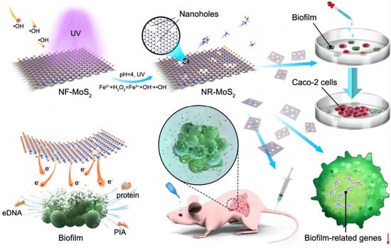 | NR-MoS2 | Nanohole | Facilitation of electron transport | 40 nm | S. aureus | The anti-infection capacity of the NR-MoS2 was found to be excellent, both in vitro and in vivo. | [202] |