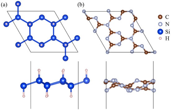 (a) Geometrical structure of a single layer of SiH seen from above and from the side, and (b) geometrical structure of a single layer of g-C3N4 seen from above and from the side.