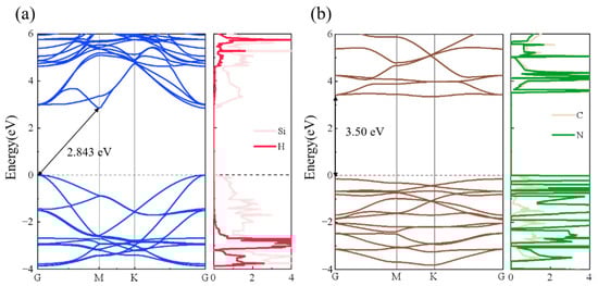 The band structures of the SiH and g-C3N4 monolayers obtained using the HSE06 functional are illustrated in Figure 1. In this figure, the black dashed line at the y-axis zero position represents the Fermi level. For the single layer of SiH in isolation, the apex of the VBM is positioned at the G point, while the nadir of the CBM is located at the K point, leading to an indirect bandgap of 2.843 eV (as shown by the arrow in Figure 2a). According to the PDOS results on the right panel of Figure 2a, it can be observed that the VBM and CBM of the isolated monolayer of SiH mainly originate from Si atoms. It can be inferred that the isolated monolayer of SiH is a semiconductor with a relatively large bandgap, which is not conducive to efficient carrier transitions. The calculated findings indicate that g-C3N4 possesses a direct bandgap of 3.5 eV (as shown by the arrow in Figure 2b). Figure 2b illustrates the band structure and PDOS of g-C3N4, with both VBM and CBM situated in the same spatial position. During electron transitions, the generated electrons and electron holes absorb energy, categorizing g-C3N4 as a direct bandgap semiconductor. From the band structures and PDOS of these two 2D materials, it can be preliminarily inferred that they do not possess the ability for photocatalytic hydrogen production. Therefore, we further investigated the 2D SiH/g-C3N4 heterostructure.
