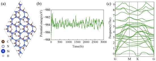 (a) View from the top of the 2 × 2 supercell heterostructure of SiH/g-C3N4. (b) Variation curve of total potential energy during molecular dynamics simulation, where the temperature was set at 300 K. (c) Calculated phonon dispersion spectrum.