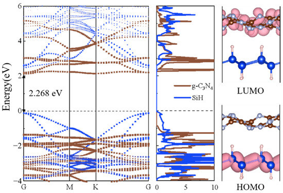 We acquired the SiH/g-C3N4 heterostructure’s projected band structure, PDOS, HOMO, and LUMO outcomes via HSE06 calculations, as demonstrated in Figure 5. In the projected band structure, there is a band overlap visible on the left-hand side of Figure 5. Analyzing the PDOS plot in the middle panel of Figure 5, we find that SiH contributes significantly to the VBM, whereas g-C3N4 plays an important role in the CBM. This suggests that the VBM and CBM of the SiH/g-C3N4 heterostructure arise in separate components, thus confirming its classification as a typical type-II heterostructure. Furthermore, the band gap of the SiH/g-C3N4 heterostructure was computed to be 2.268 eV (as shown by the arrow in the left panel of Figure 5), indicating a lower value than that of the separate SiH and g-C3N4 monolayers. This enhanced the chemical activity of the SiH/g-C3N4 heterostructure by facilitating electronic transitions between its valence and conduction bands.