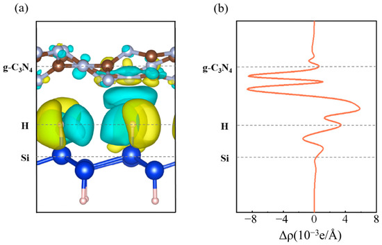 In addition, we sketch the charge transfer between the SiH/g-C3N4 heterojunction interfaces and the principle of photocatalysis in Figure 7b. First, the electrons in the VBM layer in SiH and g-C3N4 were photoexcited and transitioned to the CBM layer, and the holes remained in the VBM. Then, under the driving force of the valence band shift (VBO) and conduction band shift (CBO), photogenerated electrons and holes are collected on the CBM of g-C3N4 and VBM of SiH, respectively, and the effective separation of electrons and holes is realized. In addition, the recombination of photogenerated carriers can be alleviated within a certain range. In turn, the electrons and holes generated by photoexcitation can be applied to a great extent in the REDOX reaction, which also allows the hydrogen evolution and oxygen evolution reactions to be effectively carried out independently on different components, thus greatly improving the efficiency of photocatalysis.