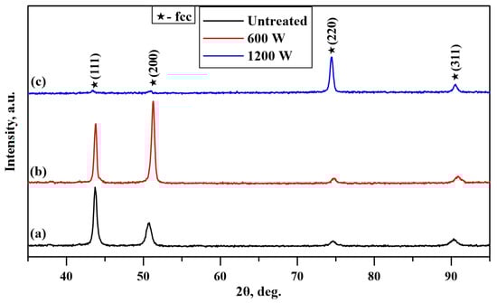 The phase compositions of the untreated Inconel alloys 625 as well as the electron-beam-treated material were studied by X-ray diffraction (XRD) experiments. The experimentally obtained XRD patterns of the initial Inconel alloy 625 as well as the electron-beam-modified alloy with a beam power of 600 and 1200 W are shown in Figure 2. No amorphous-like halos can be observed in any of the considered cases (i.e., in the pattern of the initial alloy or in the diffractograms corresponding to the electron-beam-modified specimens), meaning that the structure of the specimens is fully crystalline, and no amorphous structure can be observed. The experimentally obtained XRD patterns are typical for polycrystalline materials, exhibiting diffraction maxima of the face-centered cubic (FCC) (111), (200), (220), and (311) crystallographic planes of a Ni-Cr solid solution, belonging to the {111}, {100}, {110}, and {311} families of crystallographic planes, respectively. This structure is also known as the γ phase. It was found that the estimated phase composition remains unchanged in all the considered cases, meaning that the electron beam surface treatment procedure using the aforementioned technological conditions and a beam current of 10 and 20 mA, corresponding to a beam power of 600 and 1200 W, does not lead to changes in the above-mentioned structural parameters. It should be noted that the intensities of the observed diffraction maxima significantly differ concerning the initial Inconel alloy 625 as well as the surface-modified material by the scanning electron beam. It is obvious that the intensity of the peak corresponding to the (111) crystallographic plane is the highest in the case of the untreated material. However, the specimen modified by a scanning electron beam using a beam current of 10 mA exhibits a decrease in the intensity of the diffraction peak corresponding to the (111) plane, and the maximum of the (200) plane is characterized by the highest intensity among all the considered peaks. The pattern corresponding to the specimen treated by a scanning electron beam using a beam power of 1200 W exhibits negligible peaks corresponding to the (111) and (200) crystallographic planes, while the maximum of the (220) plane becomes much stronger in comparison with the cases of the initial Inconel alloy 625 as well as of the electron-beam-modified specimen using a beam power of 600 W. All these specific observations point to the formation of a preferred crystallographic orientation and reorientation in the microvolumes within the matrix of the considered Inconel alloy 625. As already mentioned, after the application of these technologies, the heating and cooling rates are quite high (about 104–105 K/s), and these conditions are known as the highly non-equilibrium conditions. The highly non-equilibrium conditions of the used surface modification technique are considered a prerequisite for the formation of a crystallographic texture and preferred crystallographic orientation [,]. Moreover, these effects are typical for the electron-beam-modified surfaces of metals and alloys, where similar results are demonstrated in other studies [].