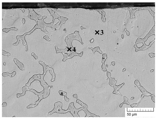 Figure 3, Figure 4 and Figure 5 show cross-sectional SEM images of the considered specimens. Figure 3 exhibits the microstructure of the untreated sample. Figure 4 corresponds to the electron-beam-modified alloy that was modified by a beam current of 10 mA, corresponding to a beam power of 600 W. Figure 5 exhibits cross-sectional images of the sample treated using a 20 mA current electron beam, corresponding to a beam power of 1200 W. Figure 5a presents a low-magnification SEM image, while Figure 5b is a high-magnification micrograph. The chemical compositions of the considered specimens are shown in Table 2. Considering the untreated specimen, it is clear that its microstructure consists of the base Ni-Cr matrix as well as some precipitates that are characterized by an irregular shape. The results indicate that the determined chemical composition of the base matrix matches very well with the data from the manufacturer. However, the elemental compositions of the precipitates exhibit a reduction in the amount of Ni and an increase in iron content. This microstructure is typical for Inconel alloys 625 []. The specimen irradiated with a beam current of 10 mA, corresponding to a beam power of 600 W, exhibits a very similar microstructure. No clearly visible modified zone can be distinguished. The precipitates are still characterized by irregular shapes, and no significant refinement can be observed in the microstructure. This means that the value of the beam power of 600 W is insufficient for microstructural modification, and no significant changes in the microstructure can be observed. It is important to note that the chemical composition of the precipitates as well as the base material matrix is very similar to that of the untreated material, meaning that the treatment under the above-mentioned technological conditions does not lead to changes in the elemental composition of the alloy (Table 2).