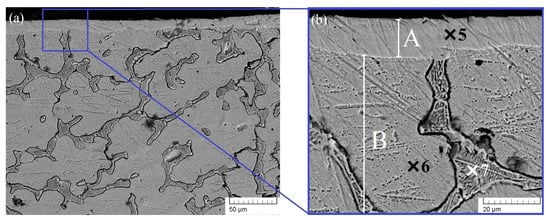 Cross section of the Inconel alloy 625 modified by a beam power of 1200 W: (a) low magnification and (b) high magnification.