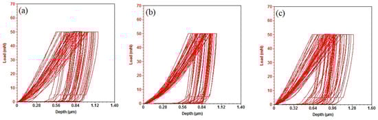 Load–displacement curves of (a) untreated sample; (b) electron-beam-modified sample with a beam power of 600 W; and (c) electron-beam-modified sample with a beam power of 1200 W.