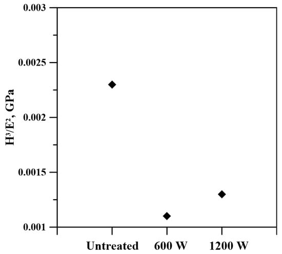 H3/E2 ratios of the untreated Inconel alloy 625 and those surface-treated with beam powers of 600 and 1200 W.