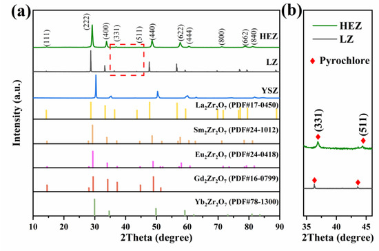 Figure 1 depicts the XRD patterns of the synthesized HEZ, LZ and YSZ powders, as well as the reference peaks of RE2Zr2O7 (RE = La, Sm, Eu, Gd, Yb) obtained from ICDD/JCPDS cards for comparison. Both the HEZ and LZ powders exhibit a single pyrochlore (P) structure, as evidenced by the characteristic super-lattice (331) and (511) diffraction peaks [20]. Notably, the diffraction peaks of HEZ shift to higher angles compared to LZ, indicating a contraction in lattice parameters attributed to the decrease in the effective ion radius. The YSZ powder presents a single tetragonal (T) structure without any impurity phases.