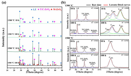 (a) XRD patterns of LZ/YSZ after sintering at 1300 and 1500 °C for 10 and 100 h, and (b) corresponding enlarged view in the range of 27~32° and 72~76°; the black lines represent the raw data, while the other lines represent Lorentz fitted curves.