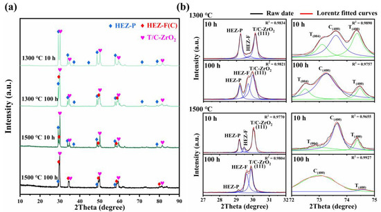 (a) XRD patterns of HEZ/YSZ after sintering at 1300 and 1500 °C for 10 and 100 h, and (b) corresponding enlarged view in the ranges of 27~32° and 72~76°. The black, green, blue and red lines represent raw data and the peaks of the tetragonal, cubic and combined curves of the two phases based on Lorentz fitting, respectively.