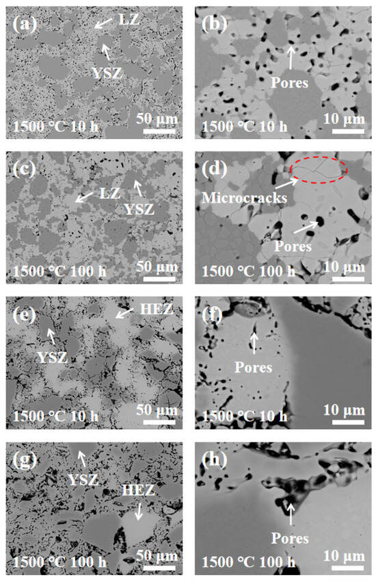 BSE images of (a–d) LZ/YSZ and (e–h) HEZ/YSZ after sintering at 1500 °C for 10 and 100 h.