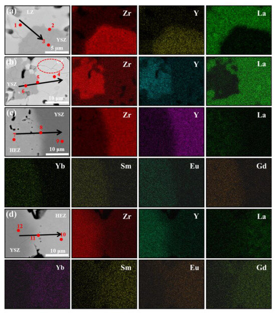 To analyze the elemental diffusion behavior in LZ/YSZ and HEZ/YSZ, the surface microstructure and elemental mapping at the interface were characterized using BSE and EDS, as presented in Figure 5 and Figure 6. Figure 5 reveals the presence of numerous pores in both composites, with a non-uniform distribution primarily concentrated in the rare earth zirconate (LZ and HEZ) regions. This non-uniform pore distribution could be attributed to the higher sintering resistance of rare earth zirconates compared to YSZ. At higher magnification, microcracks are visible in LZ, while none are present in HEZ. Additionally, the boundaries between the LZ and YSZ boundaries are sharp, whereas those between HEZ and YSZ are gradual and diffuse. The elemental distribution around the interface of the samples is shown in Figure 6, indicating an expansion in the element diffusion region as temperature increases, particularly evident in HEZ/YSZ. Table 1 summarizes the element composition at the marked position in Figure 6, where the rare earth superposition is labeled “RE”. Several notable observations are made: (1) The diffusion of Y3+ is more pronounced in LZ/YSZ than in HEZ/YSZ. This could be related to the severe lattice distortion of HEZ, which hinders the inward diffusion of Y3+ [23]. (2) RE diffuses faster into YSZ than Y3+ diffuses into HEZ (or LZ) [24,25]. (3) The RE content in the diffusion region of HEZ/YSZ increases as the ionic radius (as shown in Table 1) decreases.