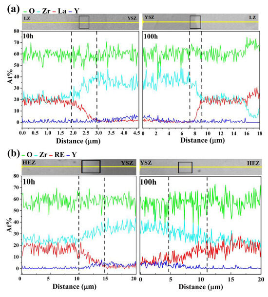 Elemental distribution along the path marked by an arrow in Figure 6: (a) LZ/YSZ and (b) HEZ/YSZ after sintering at 1500 °C for 10 (left) and 100 h (right), respectively.