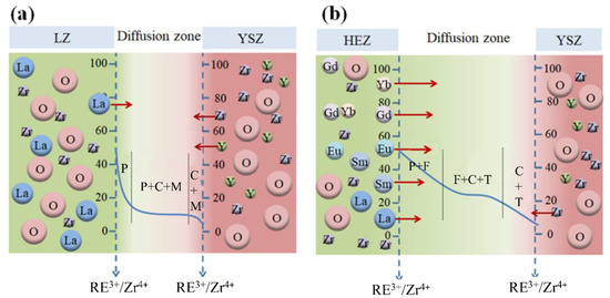 Schematics of element diffusion and phase evolution at the boundary of (a) LZ/YSZ and (b) HEZ/YSZ after sintering at 1500 °C; the vertical axis is expressed as the percentage of the cation ratio.