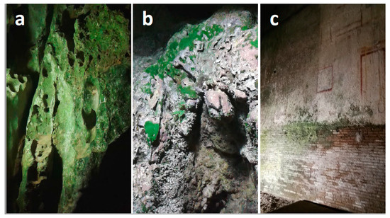 Different patterns of the widespread colonization of phototrophic microorganisms on surfaces of Cueva del Indio (Cuba) (a,b), and Domus Aurea (Rome, Italy) (c).
