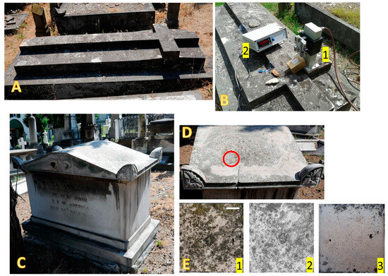 Microwave treatment on two tombstones at the monumental English Cemetery (Firenze, Italy). (A) Crustose lichens and biofilms covered the marble tombstone compromising its legibility and obscuring the stone color. (B) Treatment of the lithobionts of the same tombstone with the microwave applicator (1) of the portable equipment that is connected to a device (2) for monitoring the surface temperature. (C) A marble tombstone partially covered by crustose lichens and biofilms. (D) Surface area (red circle) where the MW treatment was applied. (E) Macro photographs of the treated area before the treatment (1), immediately (2), and about five years (3) after the treatment. Bar = 1 cm.