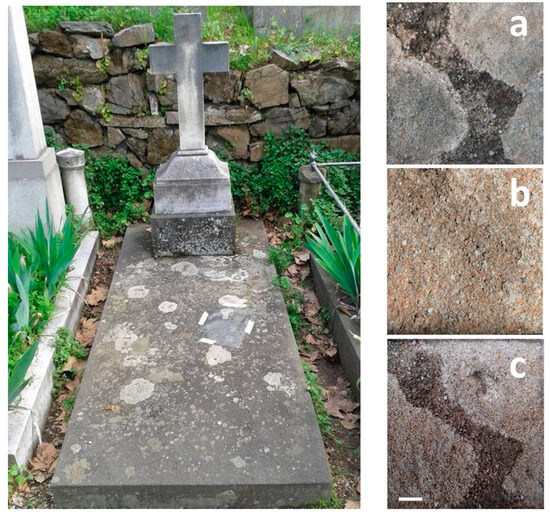 - Mascalchi, M.; Orsini, C.; Pinna, D.; Salvadori, B.; Siano, S.; Riminesi, C. Assessment of different methods for the removal of biofilms and lichens on gravestones of the English Cemetery in Florence. Int. Biodeterior. Biodegrad. 2020, 154, 105041. [Google Scholar] [CrossRef]