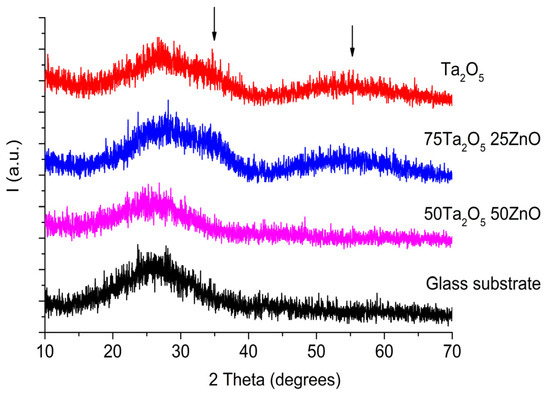 Figure 1 shows the patterns of the coatings and the substrate glass. Ta2O5-based coatings have a non-crystalline state, and for this reason, they have no diffraction peaks. The sputtering power has little effect on the microstructure of the coatings, as shown by all the XRD spectra. Similar results were reported for Ta2O5 thin films in the literature [25]. However, two broad bands can be observed in the case of Ta2O5 and 75Ta2O5-25ZnO coatings; related to a small nucleation of the tantalum pentoxide.