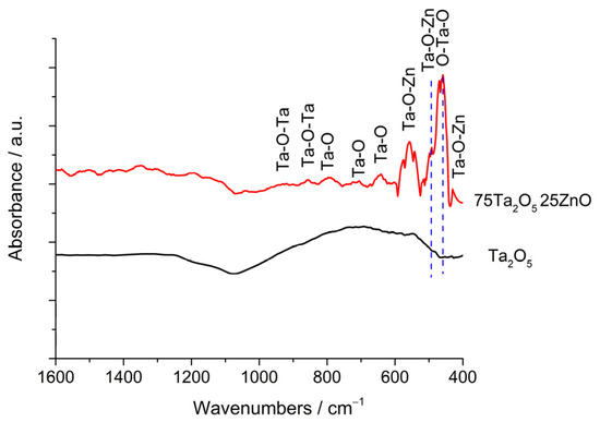 Infrared spectroscopy was used as a technique to identify the bonds present in the coatings. FTIR spectra for non-crystalline materials are different from the spectra of the crystalline materials. In crystalline materials, because there is an order in the lattice, several vibration bands for the same bond appear in the FTIR spectrum. The typical absorption bands of zinc oxide crystalline lattice were reported at 530 cm−1, 495 cm−1, 440 cm−1 and 677 cm−1 [32,34]. The FTIR bands of Zn-O- can be shifted to lower wavenumbers (420 cm−1) in compounds such as zinc–stannate [34]. In the FTIR spectra of amorphous tantalum oxide films, in the 800–1000 cm−1 range, Ta–O–Ta stretching vibrations were reported [31]. The bands in the 400–800 cm−1 region were assigned to Ta–O–Ta and Ta–O- stretching modes [31]. In the spectrum of amorphous tantalum oxide films, the band at 452 cm−1 appears due to O–Ta–O bending vibrations in TaO6 octahedra [31]. Krishnan [31] reported that amorphous and crystalline Ta2O5 was proposed as an ionic–covalent compound consisting of TaOn5−2n and Ta6O126+ clusters.