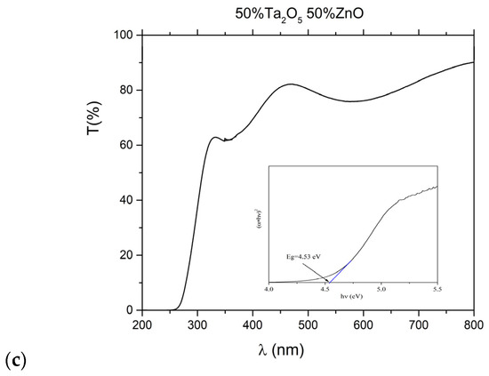 Figure 3 shows the experimental transmission spectra in the ultraviolet and visible range for studied films. The band gap and refractive index were determined using data from the UV-VIS spectra. Two different regions were observed in the pattern of the UV-VIS spectra. The transparency region is located at a wavelength higher than ~330 nm, and its characteristic is low light absorption. In the transparency region (330–1000 nm), the average optical transmittance of Ta2O5 and 75Ta2O5-25ZnO coatings is about 80% and decreases to 75% for the 50Ta2O5-50ZnO coating. It seems that this last film is opaque, hence its gray color. Even though the transmittance decreased, it is still high enough to provide good efficiency for the solar cells. The optical loss decreased a little, but if dust settles on the solar cells, the optical loss will increase much more. Interference fringes in transmission spectra occur because the incident light moves between two interfaces (air–coating, coating–substrate), producing different reflected and transmitted waves that constructively or destructively interfere within the samples. The presence of these interference fringes indicates that the coatings have optically smooth surfaces, both with the air and with the substrate, and very good thickness homogeneity [35,36,37]. The deposited coating of 50Ta2O5-50ZnO has lower transmittance as well as a small number of fringes. This could be related to its higher roughness, which results in much scattering of light over the coating’s surface [35]. In the second region (λ < 330 nm), there is a sharp drop in optical transmission. This decrease can be attributed to inter-band transitions from the valence band to the conduction band for Ta2O5 and/or ZnO [32,37].