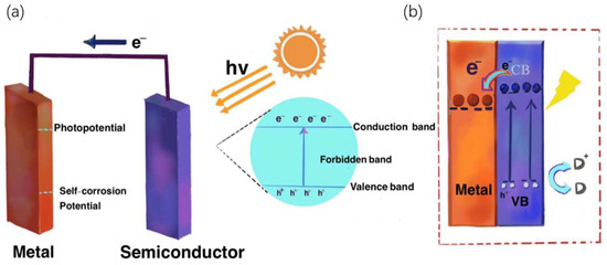 The principle of the PCP technique is shown in Figure 1. There are two forms of PCP technology in application. One is to coat the semiconductor on the exterior of the safeguarded metal [7], and the other is to connect the semiconductor material to the protected metal as a photoanode [8,9,10]. Under solar light irradiation, when the energy provided by the natural light (hv) is larger than the forbidden bandwidth of the photoanode, the electrons situated in the valence band (VB) will absorb the energy from photons and undergo excitation to jump to the conduction band (CB), producing photogenerated electrons (e−) and photogenerated holes (h+). At this time, under the influence of the space electric field, photogenerated holes migrate to the semiconductor surface, and the oxidation reaction occurs with the electron donor OH− or H2O in the solution. Parts of the photogenerated electrons are compounded with the holes and parts of the electrons are transferred to the metal to which they are connected. In this process, the semiconductor is used as a photoanode that can generate photogenerated electrons and the photogenerated electrons are moved onto the coupling metal so that the metal surface potential decreases, thereby effectively inhibiting metal corrosion.
