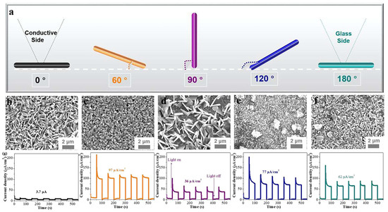 TiO2 nanomaterials are often used as photoanode materials for PCP because of their outstanding photoelectric characteristics and remarkable stability, but there are still many critical defects to be overcome for their pFractical applications. Firstly, the forbidden bandwidth (~3.2 eV) of TiO2 is too wide, resulting in low utilization of visible light, and it can only respond to ultraviolet (UV) light at a wavelength of λ < 387 nm. In addition, the photogenerated carriers in pure TiO2 are easily compounded, which prevents them from providing PCP for metals in dark conditions [11]. For this reason, TiO2 has been modified to broaden its capacity to absorb light into the visible spectrum. The structure of the semiconductor is modulated to inhibit the photogenerated electron-hole complexation, thus, improving the electron utilization. Li et al. [12] tuned the ratio of TiO2 crystal surface on the F-doped Tin Oxide (FTO) substrate by changing the growth angle and a meshed TiO2 film exhibiting superior photoelectric conversion efficiency was achieved. The orientation of the FTO concerning the lower surface was modified using a fixture, as illustrated in Figure 2. All TiO2 films grown at different angles exhibited a plate-like morphology, each with a thickness ranging from 50 to 100 nm. TiO2-60° exhibits the best photovoltaic conversion efficiency due to the exposed area of the TiO2 (101) crystal surface.