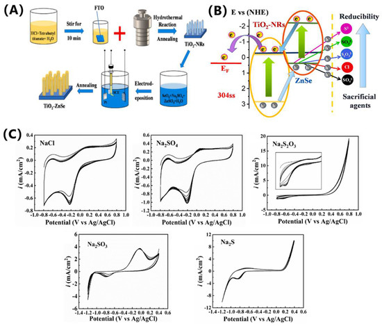 (A) Preparation process of TiO2 and TiO2/ZnSe film; (B) Cyclic voltammetry curve of NaCl, Na2SO4, Na2S2O3, Na2SO3, Na2S; (C) PCP mechanism of TiO2/ZnSe under illumination [33].
