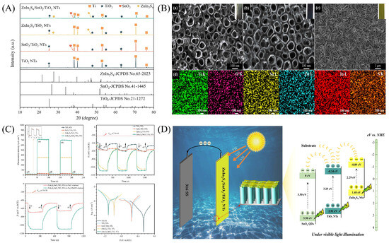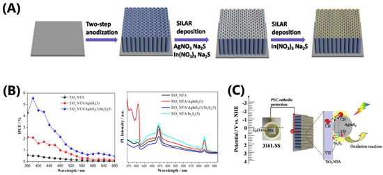 Three-component metal sulfides possess unique optoelectronic properties and stability, with a narrow bandgap and a more negative conduction band potential. This enables them to broaden the visible light response range and boost the density of charge carriers in TiO2, thereby facilitating the separation of photo-generated electron-hole pairs and providing protection to metals with more negative self-corrosion potentials. Ma et al. [34] successfully prepared TiO2/ln2S3/AgInS2 by two-step anodization of titanium foil followed by ion layer adsorption and reaction. TiO2/ln2S3/AgInS2 exhibited high photocatalytic activity under visible light, with a significant decrease in the photocurrent potential of up to 950 mV and a decrease in current density of up to 30 A⋅cm−2. Therefore, compared to pure TiO2, coupled with 304 SS, TiO2/ln2S3/AgInS2 can provide more efficient photo-electro-chemical cathodic protection under visible light. Sun et al. [35] also prepared and optimized AgInS2/In2S3 nanoparticles co-sensitized TiO2 nanotube array photoanodes with an In2S3 buffer layer around the AgInS2 absorber layer (Figure 4). The In2S3 buffer layer around the absorber layer greatly enhances the efficiency of charge generation and separation in the prepared photoanodes. Li et al. [36] successfully prepared ZnIn2S4/TiO2 nanotube composites by combining hydrothermal reaction with electrochemical anodic oxidation. The photo-electric current density of the 3D ZnIn2S4/TiO2 nanotube composites coupled with Q235 carbon steel (CS) can reach 400 mA/cm2, and the composite photoanode exhibits a photo-generated potential drop of approximately 360 mV, providing an effective PCP for Q235 CS under visible light irradiation. Li et al. [37] successfully prepared SnIn4S8/TiO2 composites through solvent-thermal treatment and electrochemical anodic oxidation. SnIn4S8 has a large specific surface area and its nanosheets have relatively negative conduction bands, therefore, SnIn4S8 nanosheets modified TiO2 had better photo-electro-chemical and PCP properties. Additionally, the maximum photo-electric current density of the composite material during a 6 h solvent-thermal reaction under visible light irradiation is 100 μA cm−2, and the negative shift of the photo-induced potential for Q235 CS connected to the composite material can reach −450 mV. In addition, many other three-component metal sulfides are used to complex TiO2 and to modify the PCP effect of TiO2 on metals [38,39,40,41].