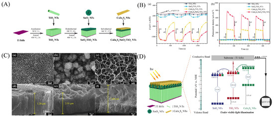 (A) Flowchart of the preparation of CaIn2S4/SnO2/TiO2; (B) SEM images; (C) Variation curves of the photoluminescent current and photo-open potential of Q235 carbon steel coupled with different photoanodes under open and closed light conditions; (D) Protection mechanism diagram [49].