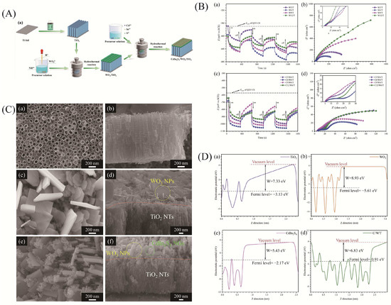 Tungsten trioxide (WO3) is considered as a potential material for photoelectrodes due to its wide range of photo-responses, high electron mobility, and non-toxicity. The process of storing electrons and releasing electrons from WO3 is realized by the conversion between MxWO3 (M = H, Li, Na, etc.) and WO3. Under light, WO3 store electrons in the form of MxWO3. Under dark conditions, the stored electrons are released and MxWO3 is converted to WO3, which enables continuous PCP of coupled metallic materials [50,51]. However, WO3 semiconductors suffer from the drawbacks of low efficiency of photogenerated electron-hole separation and inability to charge themselves. Tian et al. [52] constructed WO3/ZnIn2S4 composites with good dark continuous PCP performance by utilizing ZnIn2S4-modified WO3, which has a more negative CB potential. Its photo-generated potential drop in NaCl solution can reach 332.8 mV, which is markedly superior to that of WO3 and ZnIn2S4 photoelectrodes. Meanwhile, the ZnIn2S4 composite on WO3 can charge WO3 under light, allowing the WO3/ZnIn2S4 photoanode to continue providing protection for the coupled 304 SS even after the light is turned off. The WO3/ZnIn2S4 heterojunction photoelectrode can store 0.17 C electrons when the light illumination time is 2 h, which can offer protection for the coupled 304 SS in the dark state for 11.88 h after the light is turned off. Zhu et al. [53] successfully prepared CdIn2S4/WO3/TiO2 photoanodes by using anodic oxidation and a two-step hydrothermal method to deposit WO3 nanosheets and CdIn2S4 nanoparticles sequentially on TiO2 nanotubes (Figure 7). The researchers explored the effects of different hydrothermal times on the PCP performance of the prepared photoanodes, and the best PCP performance of CdIn2S4/WO3/TiO2 on Q235 carbon steel was achieved when the hydrothermal time of both steps was 6 h. The PCP of Q235 carbon steel was achieved with the highest photocurrent density (633 μA cm−2), the lowest charge transfer resistance (11.34 Ω⋅cm2), and the largest open-circuit potential drop (490 mV vs. SCE). The researchers analyzed the work function of CdIn2S4, WO3, TiO2, and CdIn2S4/WO3/TiO2 by DFT calculations. In addition, CdIn2S4/WO3/TiO2 can provide continuous protection for Q235 carbon steel in the dark for up to 10 h.