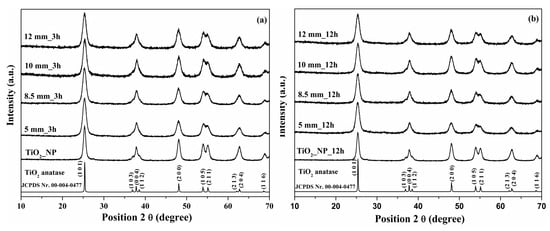 For the 12 h paste (Figure 1b), it could be noted that the intensity of the (1 0 1) crystal plane suddenly dropped by 40% for the paste made with 5 mm balls and continued to decrease to 50% for the paste made with 8.5 mm and 10 mm balls. Even if the grinding time increased from 3 h to 12 h, it could be noted that the intensity of the peak was still 45% for the paste made with 12 mm balls compared to the intensity of the peak for Ti_NP. All of the diffraction peaks were indexed with JCPDS No. 00-004-0477 as TiO2 crystallized in anatase form, and no other phases or impurities were observed. The (1 0 1) peak intensity and crystallite size of the Ti_NP paste using 5 mm balls, 8.5 mm balls, 10 mm balls, and 12 mm balls are shown in Table 1. A similar evolution of the crystalline size determined the value of 9.5 nm for the paste made with 12 mm balls.
