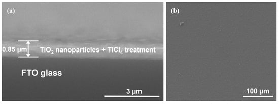 Figure 2 shows the SEM images of the TiO2 photoanode using a high-energy planetary ball mill with 5 mm balls at a 3 h rotation. During the deposition process, the same tape was used for all photoanodes ensuring uniform film thickness across all samples. From the cross-section (Figure 2a), the thickness of the photoanode was 0.85 µm, and from the top section of the obtained photoanodes (Figure 2b), a uniform deposition without cracks could be noted.