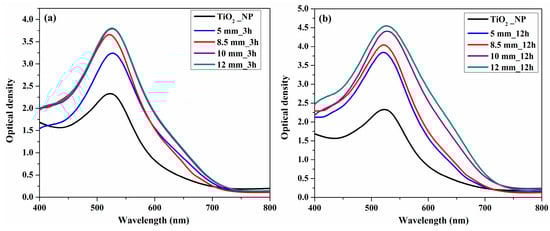 Optical density spectra of photoanodes obtained from paste using 5, 8.5, 10, and 12 mm balls at different rotation time (a) 3 h and (b) 12 h.