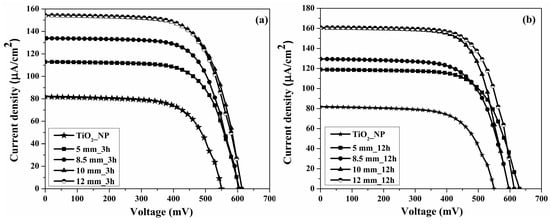 J-V measurements of DSSCs for TiO2 paste untreated (TiO2_NP) and obtained from paste milled with 5 mm, 8.5 mm, 10 mm, and 12 mm balls at different rotation time (a) 3 h and (b) 12 h, under 1000 lux illumination.