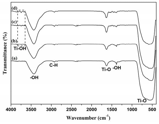A special absorption band was detected at 3748 cm−1 that may be associated with the hydroxyl group (Ti–OH) of stretching mode of vibration for TiO2 nanoparticles []. With ball sizes increasing from 5 to 12 mm, the TiO2 surfaces were highly hydroxylated, improving the presence of the Ti–OH groups. The surface of the Ti–OH groups is amphoteric, and their ionization equilibrium can be written as (Equations (2) and (3)) []: