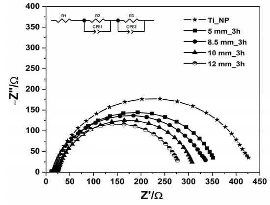 Impedance spectra of DSSCs for untreated TiO2 paste (TiO2_NP) and using different ball sizes (5, 8.5, 10, and 12 mm) at 3 h rotation time, under 1000 lux of the illumination intensity. The inset shows the equivalent circuit diagram used to fit the observed impedance spectra.